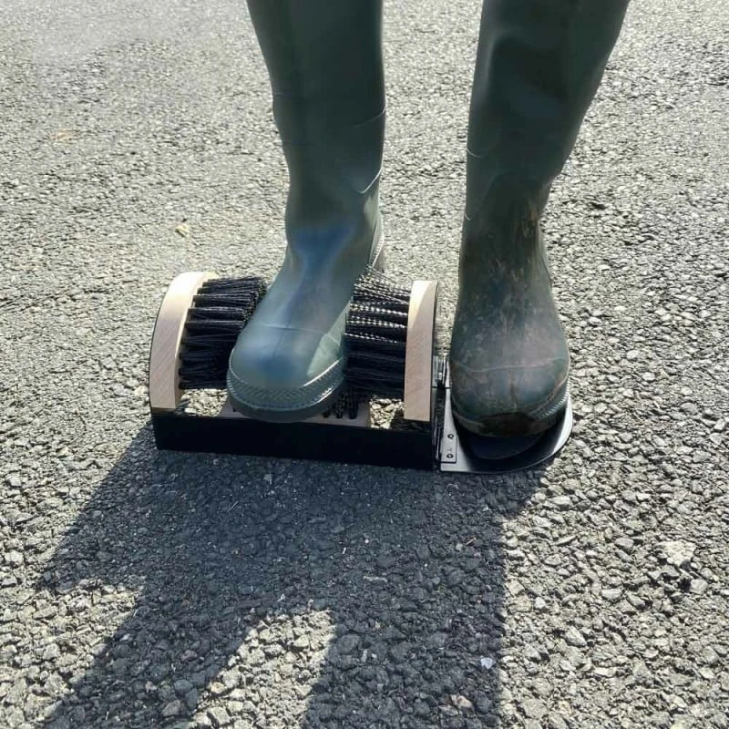 - Le support rabattable latéral vous permet de bloquer la structure d’un pied, pendant que vous insérez l’autre entre les brosses. Vous pouvez toutefois fixer le gratte bottes au sol si besoin, la visserie est fournie.