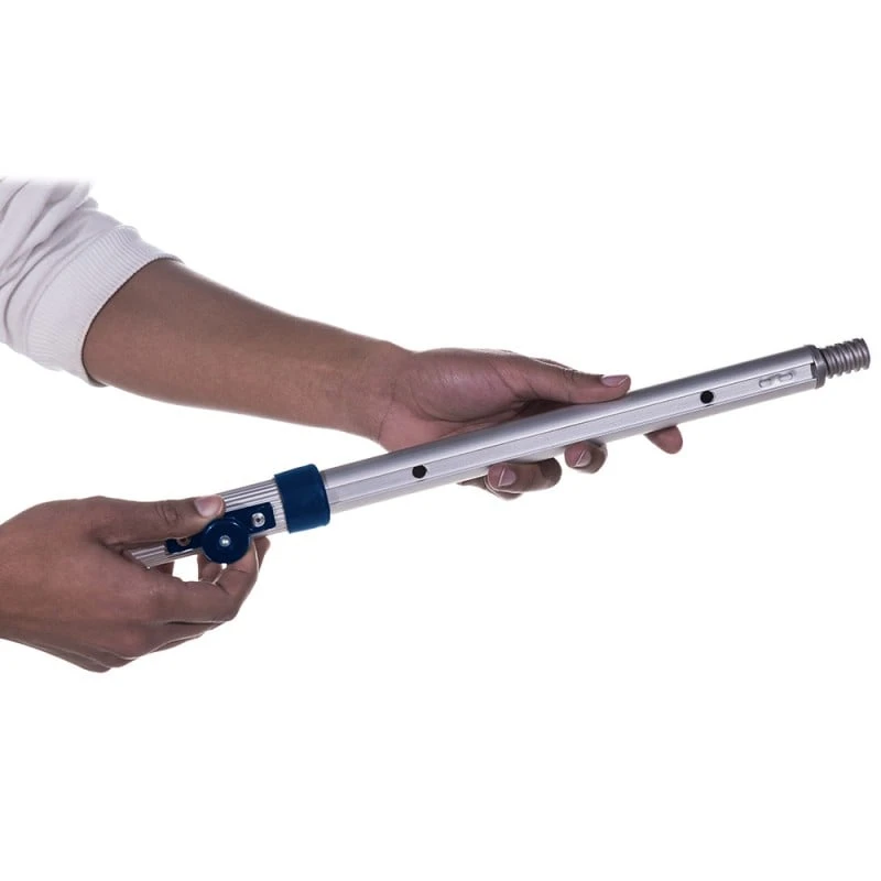 - Ce manche télescopique en aluminium est composé d’un système de blocage à pivot qui permet de régler la barre à la dimension souhaitée. Le système de blocage se fait par bouton poussoir qui, une fois tiré, permet de faire coulisser la barre pour atteindre le trou d’encrage voulu. Une fois atteint, il suffit de lâcher le bouton afin de bloquer la barre.