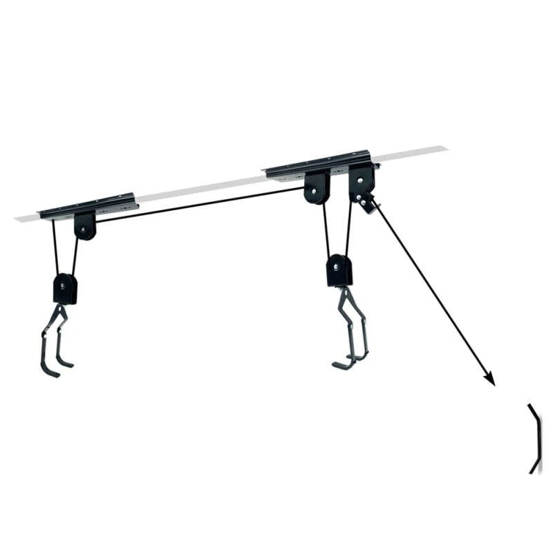 - Optimisez votre espace de rangement dans votre garage, votre cave ou encore dans votre pièce de rangement de votre appartement grâce à ce porte vélo pour plafond. Son système de crochets (recouverts d’une couche de plastique), viendra supporter votre vélo de route comme votre VTT au niveau du guidon et de la selle.