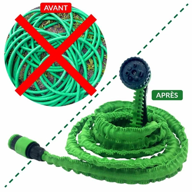 - Finis les tuyaux emmĂȘlĂ©s : une fois l’arrosage terminĂ©, il reprend sa taille initiale sans jamais s’emmĂȘler.